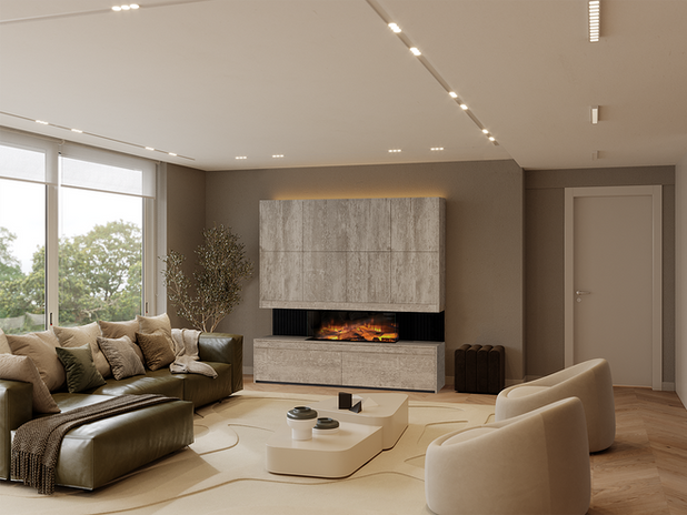 EMBERLUX marries soft close cabinetry, wood panelling & quartz worktops with our stunning, best-selling Evonic fires.