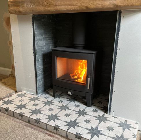 This allowed us to work with the existing external chimney while delivering a clean, modern solid-fuel installation.